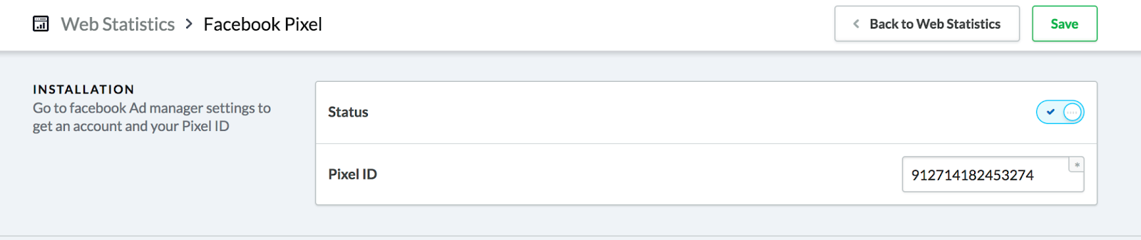 - Une fois que vous avez votre ID Pixel Facebook, allez dans votre back-office Lightspeed eCom, puis dans Paramètres > statistiques Web > Pixel Facebook, et copiez/collez l’ID du pixel.