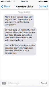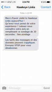 Ce type de texte est très similaire au message texte du sondage, sauf qu’il demande à vos clients d’évaluer publiquement votre terrain de golf sur des sites Web comme GolfAdvisor, Yelp, GoogleMyBusiness, et plus. Assurez-vous de fournir un lien dans le texte qui mène à une page d’atterrissage où ils pourront rapidement remplir leur commentaire.