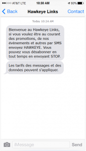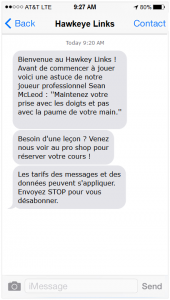 Assurez-vous que les clients sont au courant de votre campagne de marketing par SMS. Pour ce faire, vous pouvez installer une affiche sur votre terrain, près du point de vente du pro shop, dans le stationnement ou dans le restaurant pour rappeler au client d’envoyer le mot-clé “Consentement” à un numéro précis pour qu’ils puissent s’abonner.