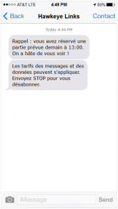 Bien que ces messages soient plus pratiques et moins axés sur le marketing, ils peuvent aider à améliorer l’expérience de vos clients. Les SMS sont un moyen rapide d’informer les clients que votre club est fermé pour cause de mauvais temps ou de rappeler à un joueur que son heure de départ approche.