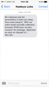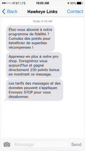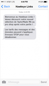 Encore une fois, n’envoyez pas de messages en masse à toute votre base de données pour annoncer que vous avez les nouveaux TaylorMade M6 en stock. Au lieu de cela, joignez votre annonce à des messages que vous envoyez déjà. De plus vous pouvez envoyer un code promo à utiliser dans votre pro shop. Vous pourrez ensuite mesurer l’impact de vos SMS en observant le nombre de fois que le code promotionnel a été utilisé.