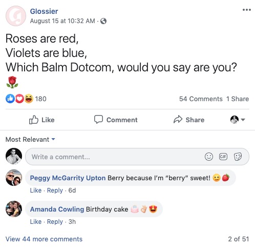 Dans l’exemple ci-dessus, la société de produits de beauté Glossier a posé une question à son public, ce qui suscite naturellement davantage de réactions et de commentaires sur la publication.