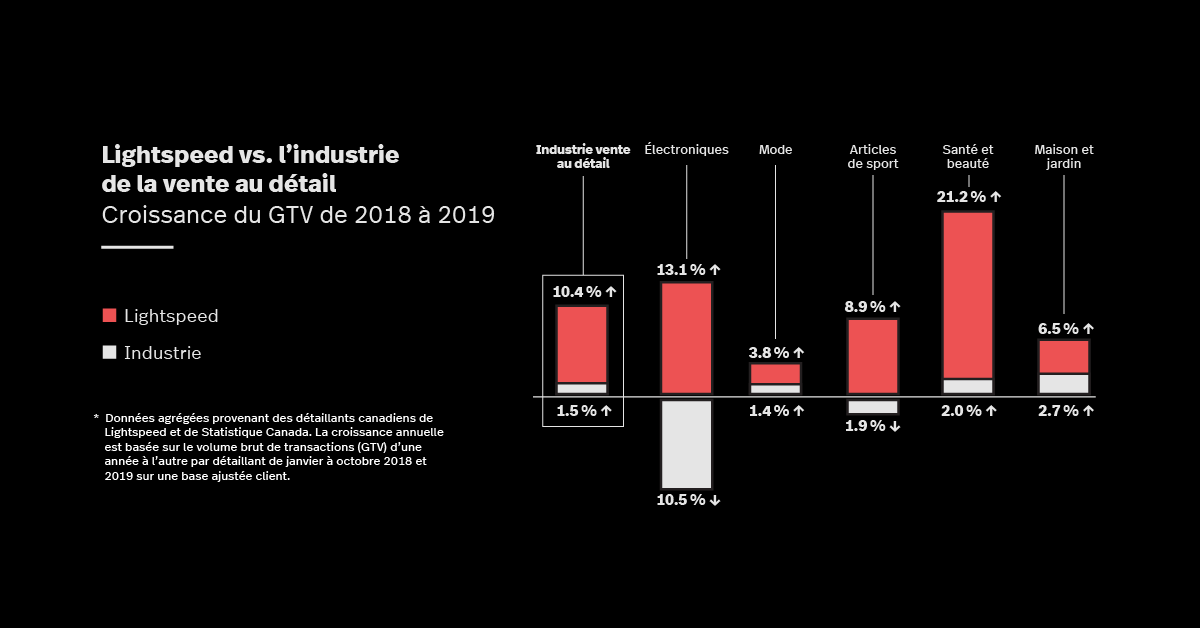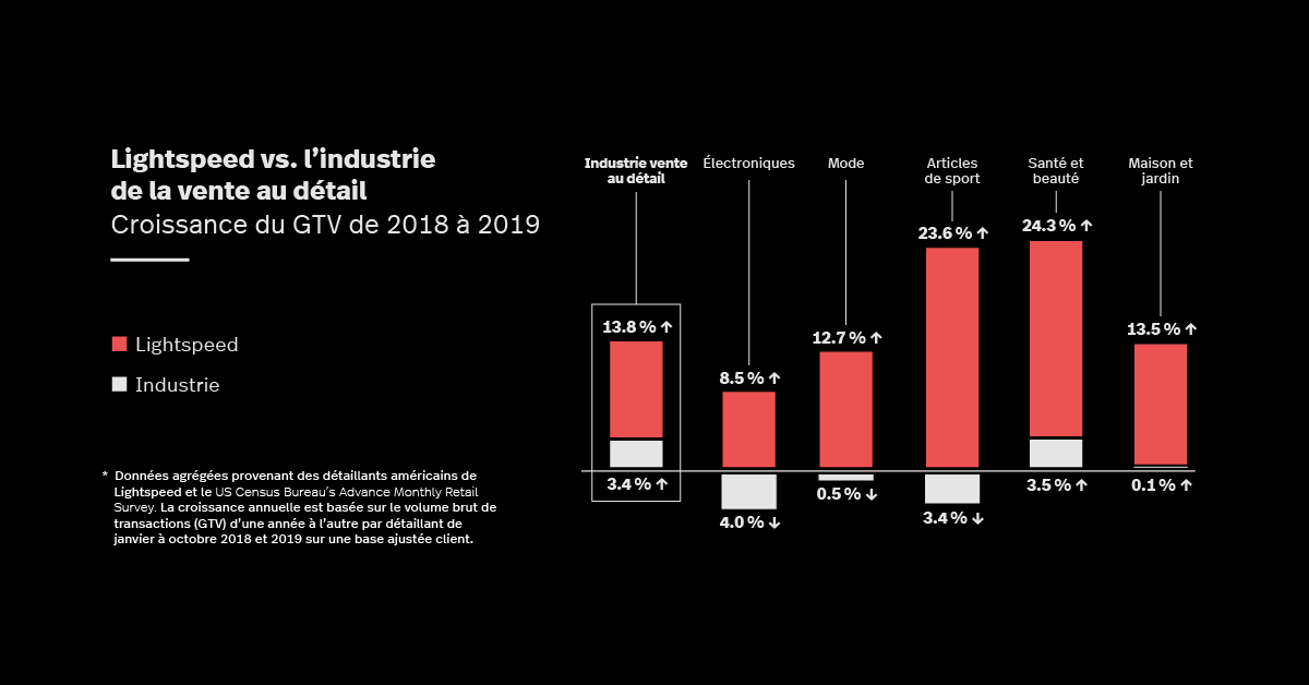 Cependant, les commerçants utilisant Lightspeed ont quant à eux enregistré une croissance sans précédent en Amérique du Nord. En effet, nos détaillants américains ont connu une croissance quatre fois plus rapide que la moyenne de l’industrie, alors que nos détaillants canadiens ont fait encore mieux, en enregistrant une croissance six fois plus rapide que celle de l’ensemble du secteur !