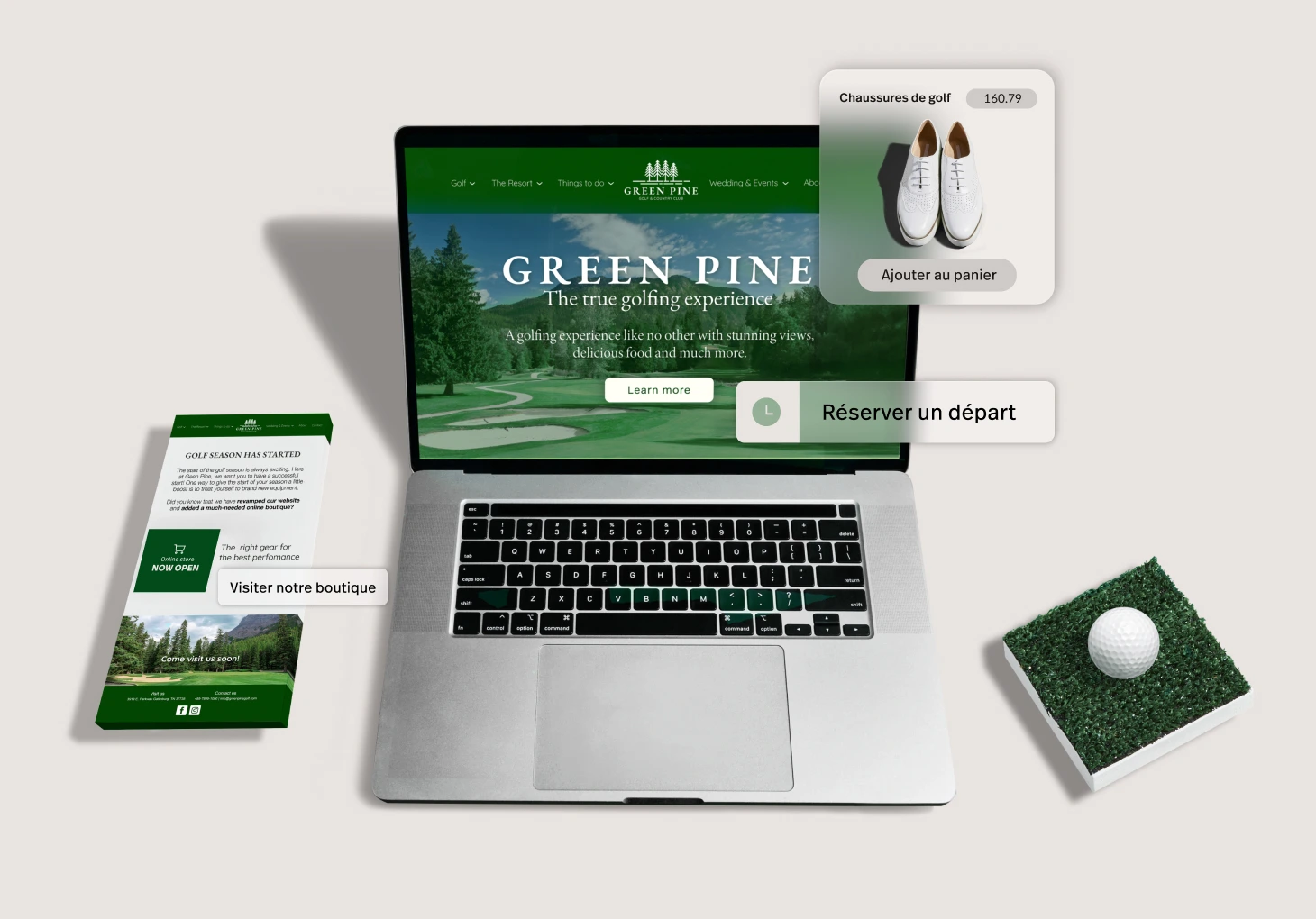 - Accédez à une équipe créative complète qui conçoit de magnifiques éléments marketing adaptés à votre terrain de golf