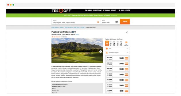 TeeOff est un puissant marché en ligne pour heures de départ qui vous permet d’ajouter un autre mode de réservation pour les golfeurs. Grâce à la visibilité accrue du marché en ligne, les nouveaux golfeurs trouveront plus facilement votre parcours et deviendront des clients réguliers.